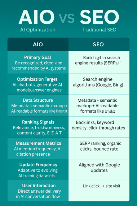 Unlike SEO’s keyword focus, AIO favors answering real user intent through conversational phrasing and question clusters—mirroring natural queries.